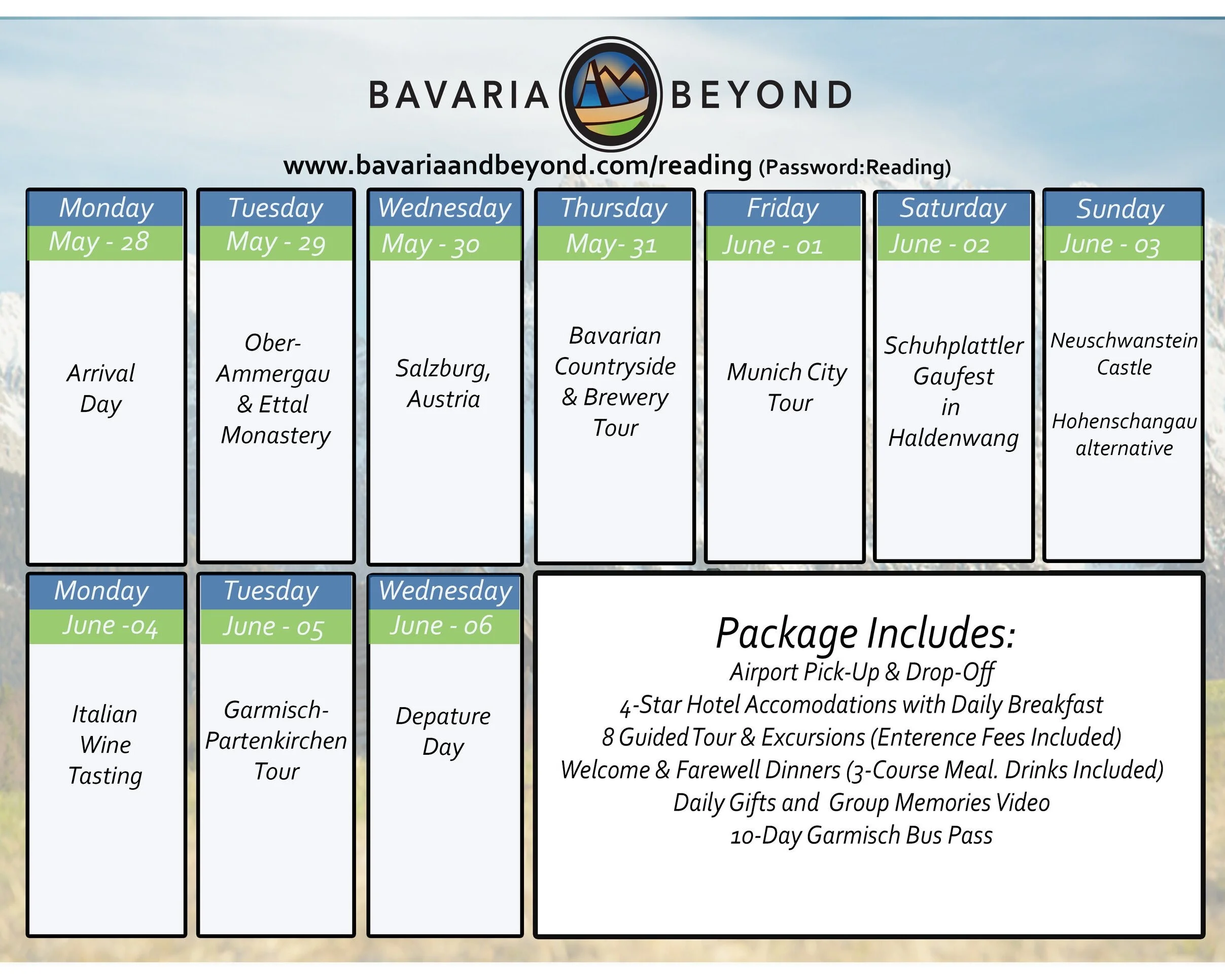This dining package is the most flexible option while still including a major trip expense in the package price. Prior to the tour, a set amount of money will be budgeted into the trip for daily meals. During the tour any group meals will be covered by these funds. All expenses will be tracked with any left over money being refunded in a single lump sum or divided evenly amongst the group.